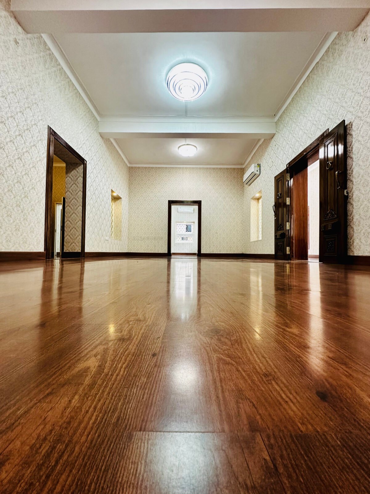 On the ground floor, the living room features parquet flooring and connects to two identical rooms, each with dressing areas and newly renovated bathrooms. A wide passageway guides guests to the stairway and a separate dining area, conveniently positioned next to a spacious kitchen and restrooms. Toward the rear, a thoughtfully placed wash area enhances functionality. The expansive backyard serves as both a parking space and a charming outdoor venue, shaded by lush mango trees that offer respite even on the warmest days.